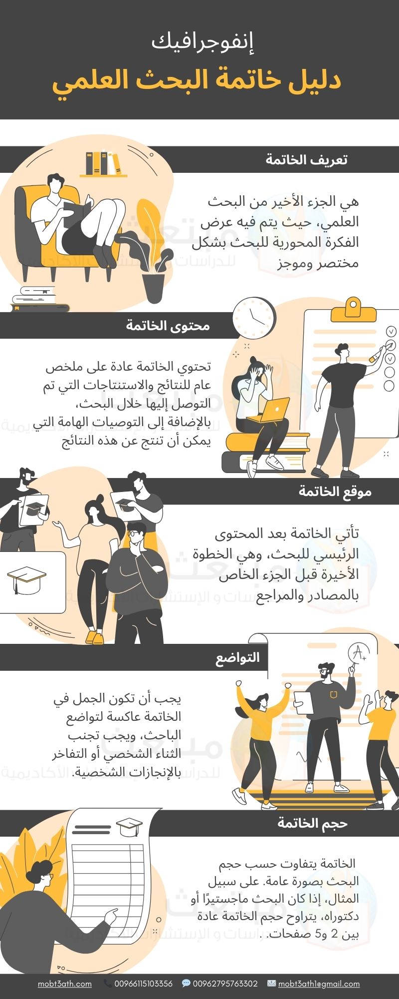 هي عبارة عن عرض لفكرة البحث المحورية، ويُكتب ذلك بشكل عام دون وضع تفصيلات سبق توضيحها في متن البحث، كما يُشير الباحث للجُهد المبذول، بدايةً من اختيار موضوع الرسالة، وحتى النهاية، ويُمكن توضيح مُلخَّص عام للاستنتاجات التي تم تدوينها، وكذلك التوصيات المهمة، وينبغي أن تكون الجُمل المكتوبة في خاتمة البحث عاكسةً لتواضُع الباحث، ونُكرانه لذاته، وبعيدًا عن الثَّناء الشخصي.